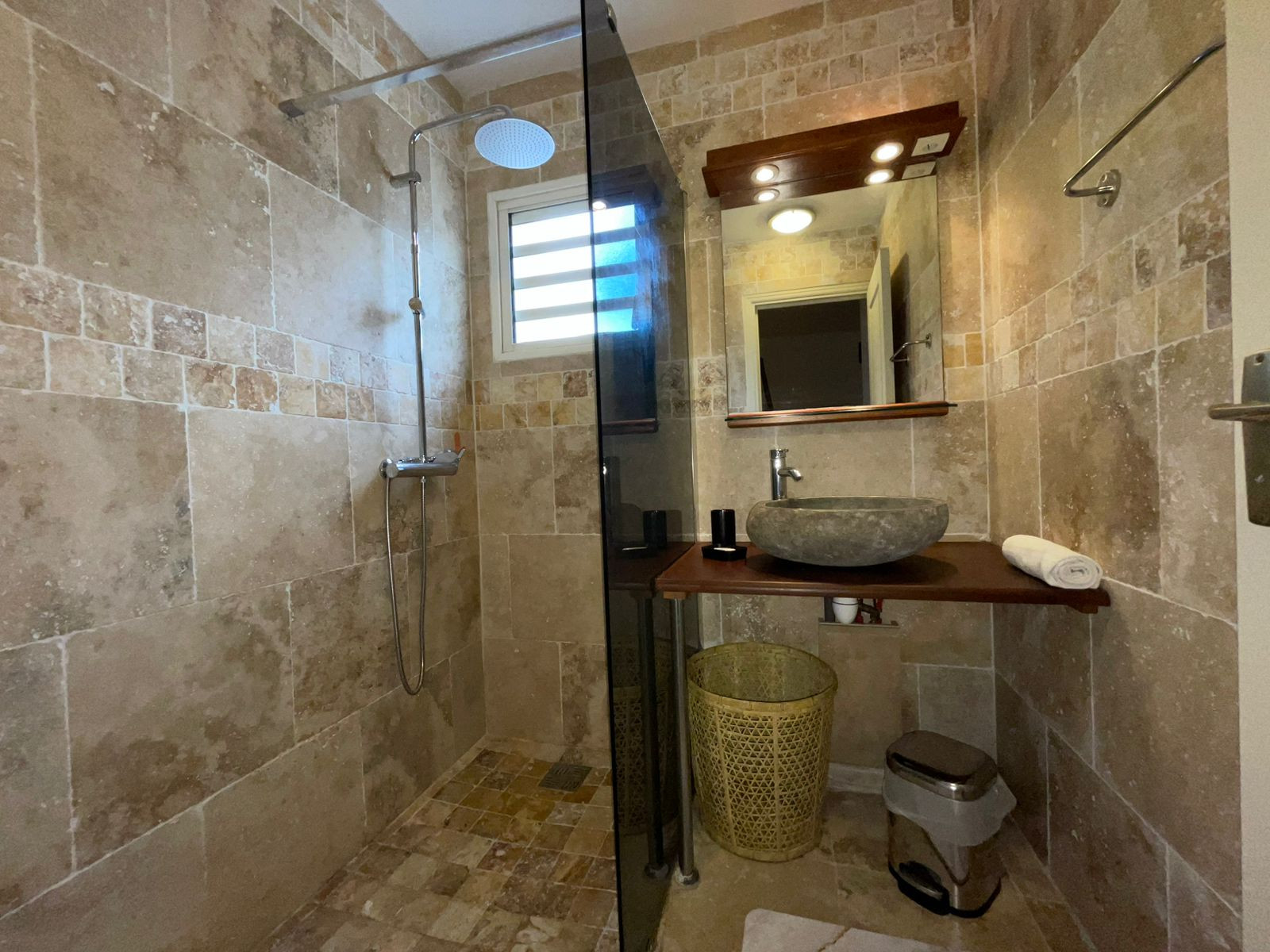 ✅ A functional bathroom equipped with an Italian shower, a washbasin and a storage area.