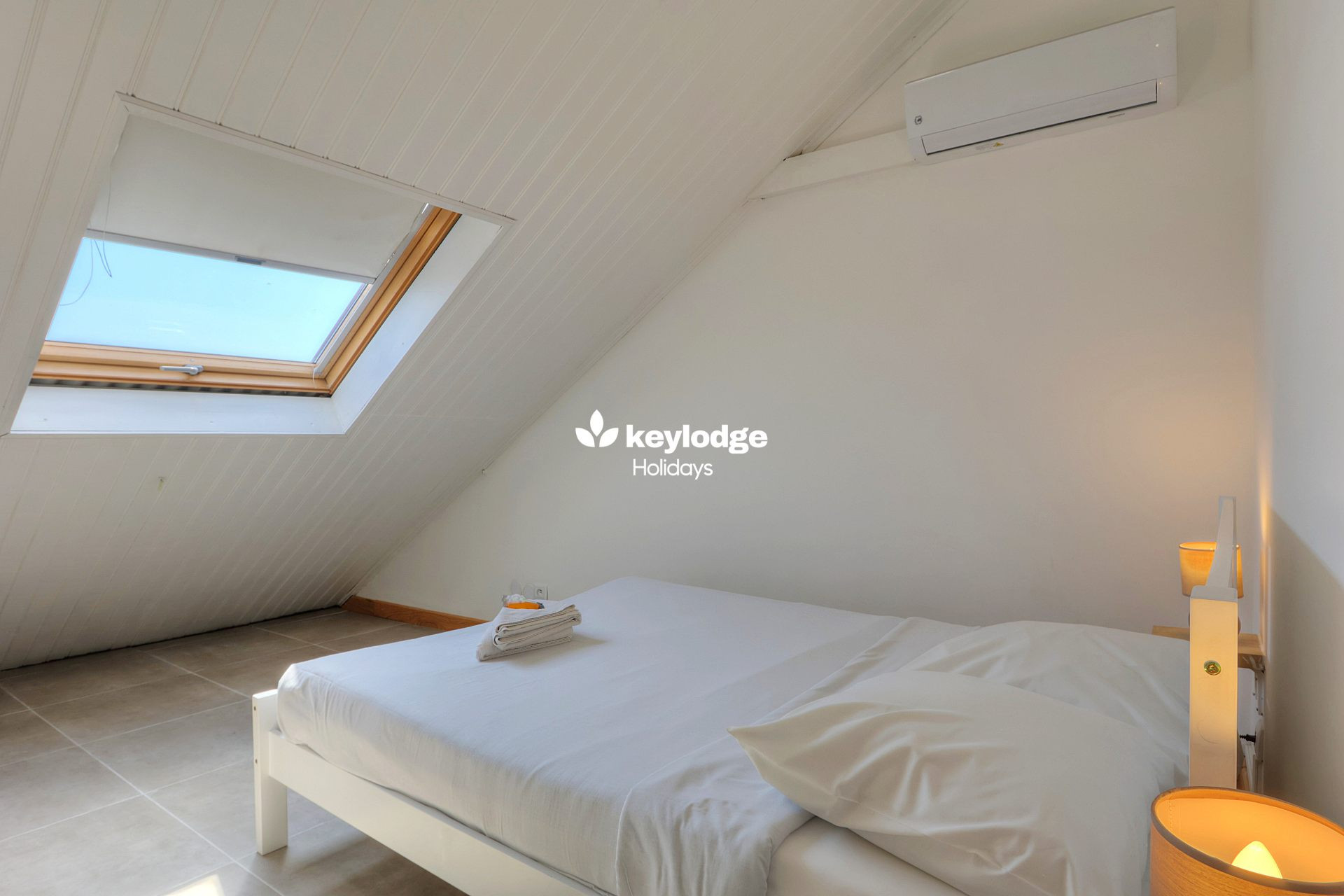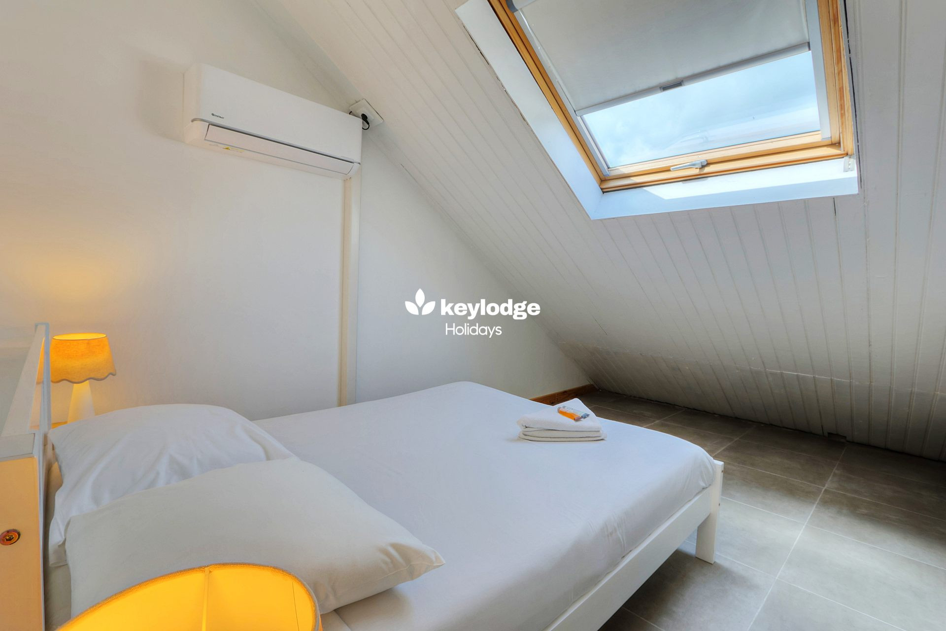 ✅ Upstairs, two air-conditioned bedrooms with a double bed and a storage cupboard.