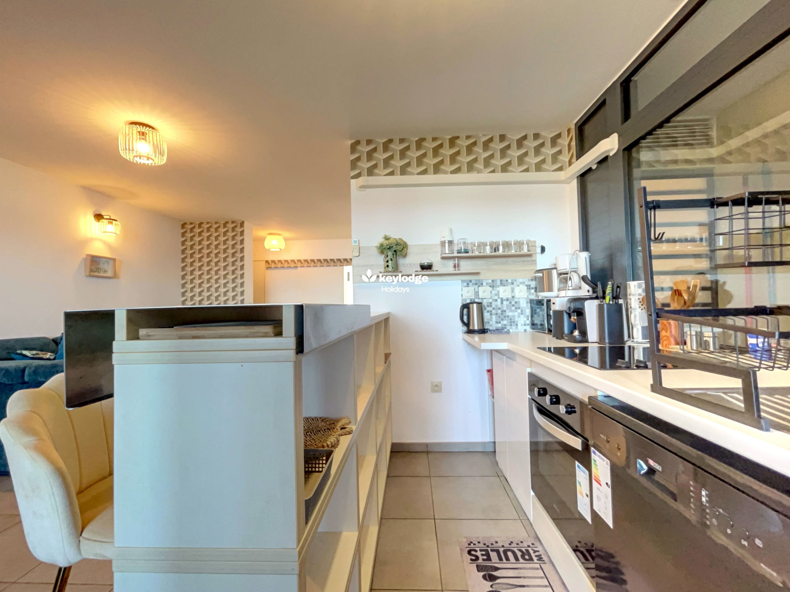 ✅ A fully fitted and designed kitchen for your stay, with all crockery, kitchen utensils, kettle, microwave, dishwasher, a refrigerator and its freezer. It also has a high table for two people.