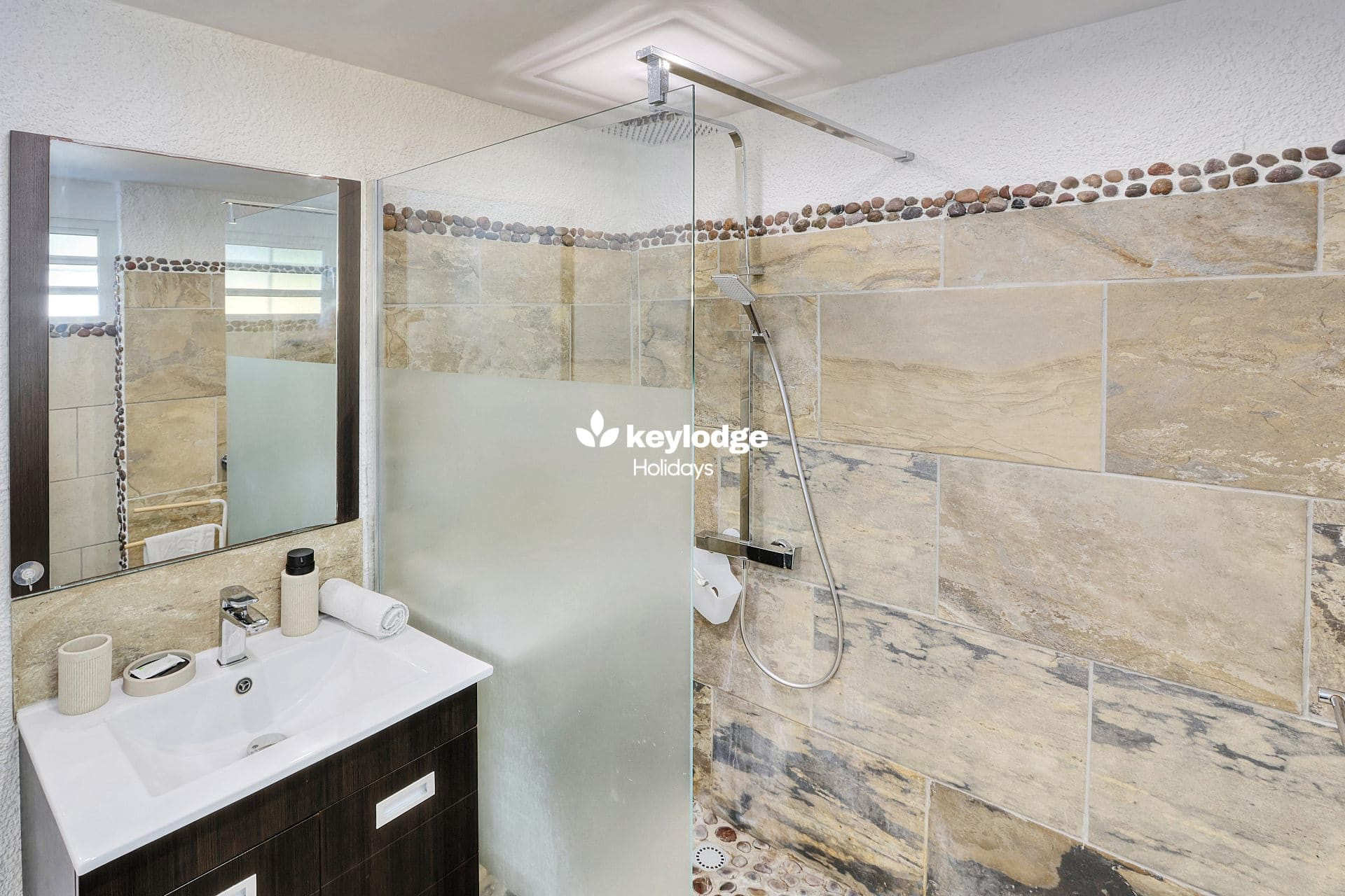 ✅ A functional bathroom, fitted with a washbasin, walk-in shower, washing machine, and a hairdryer.