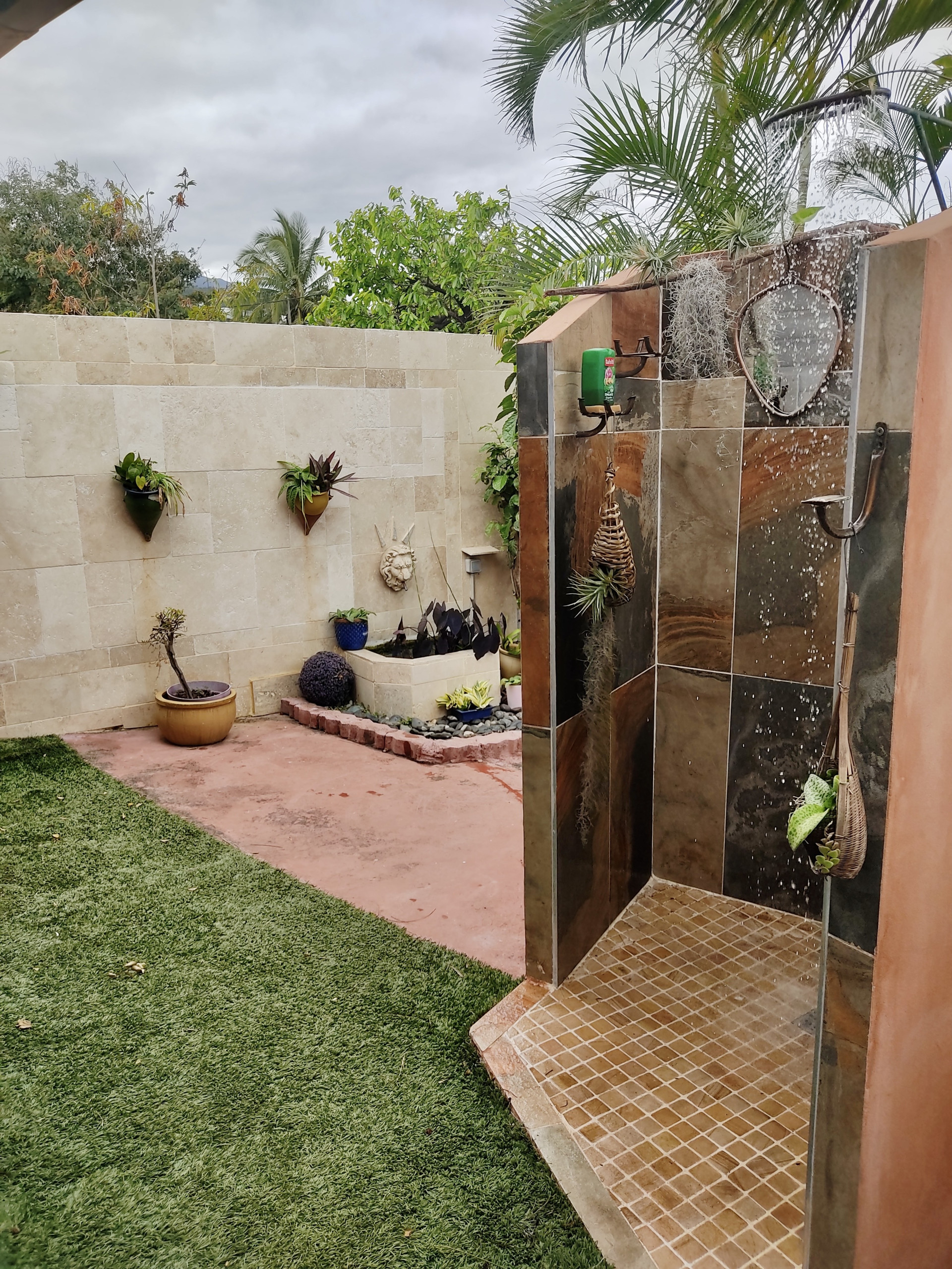 ✅ An outdoor area fitted with garden furniture, jacuzzi and outdoor shower, ideal for watching the sunset after a day at the beach.