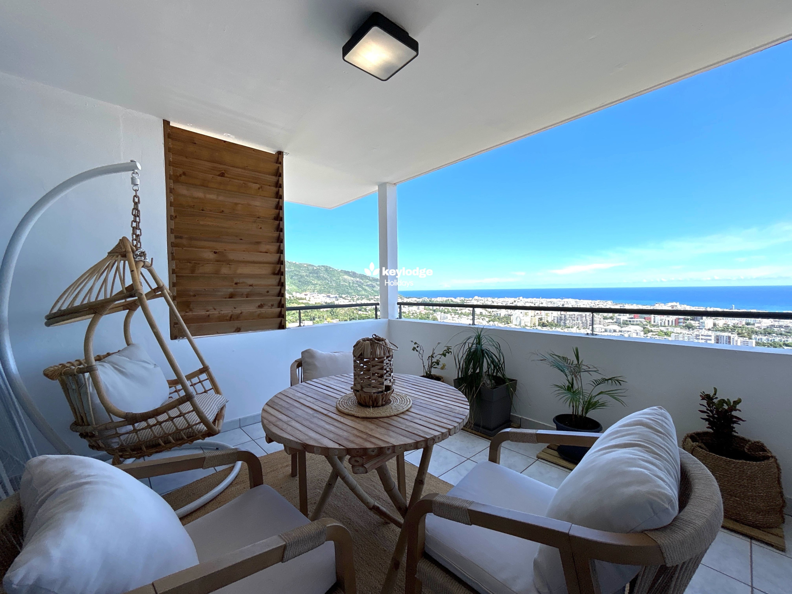 ✅ Une terrasse couverte aménagée avec mobilier d’extérieur avec vue sur la ville de Saint-Denis, idéale pour un apéro convivial en après-midi.