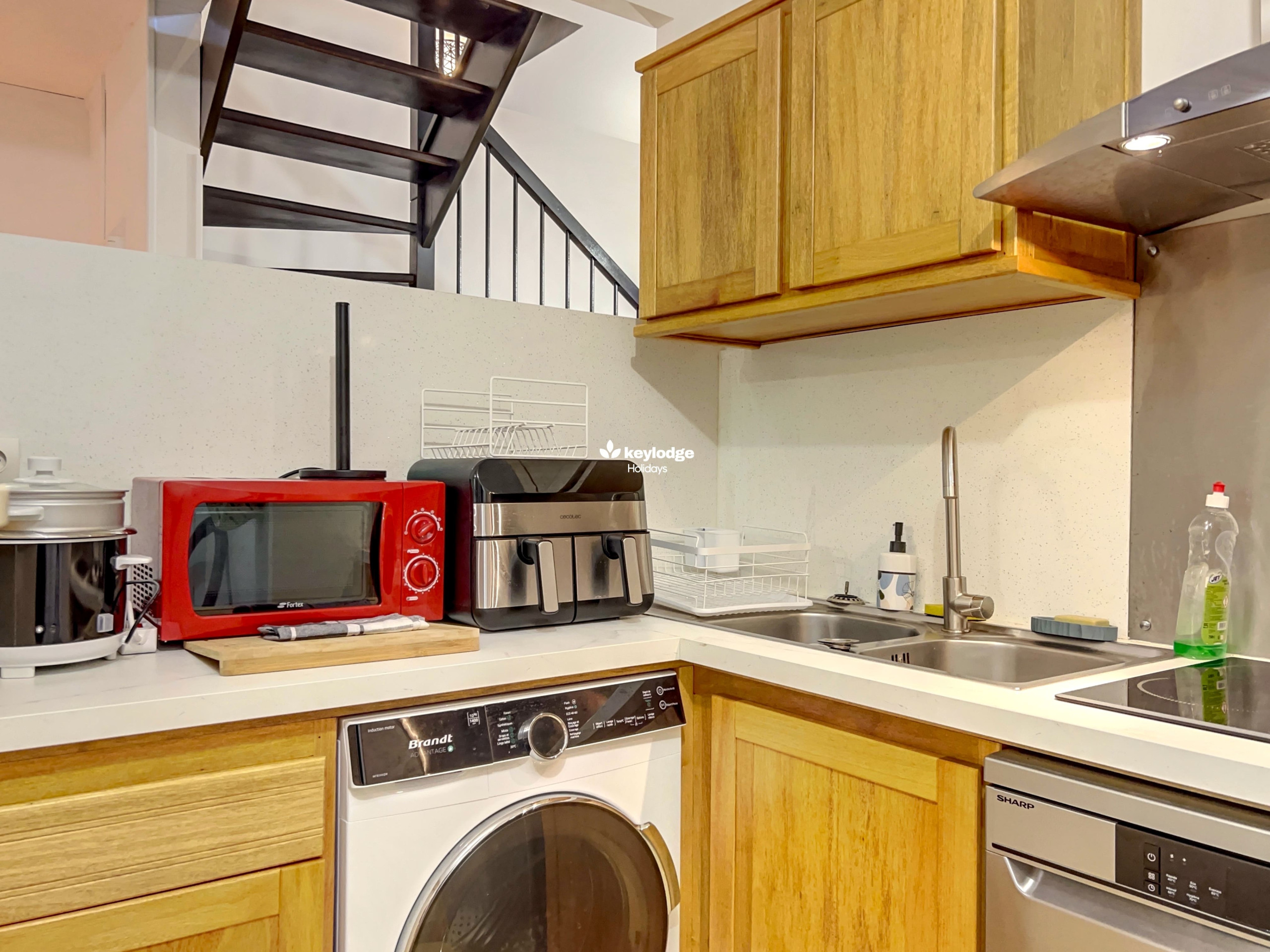 ✅ Une cuisine intégralement agencée et pensée pour votre séjour, avec toute la vaisselle et ustensiles de cuisine, cafetière, bouilloire, micro-ondes, four, grille-pain, lave-vaisselle ainsi qu’un réfrigérateur et un congélateur.