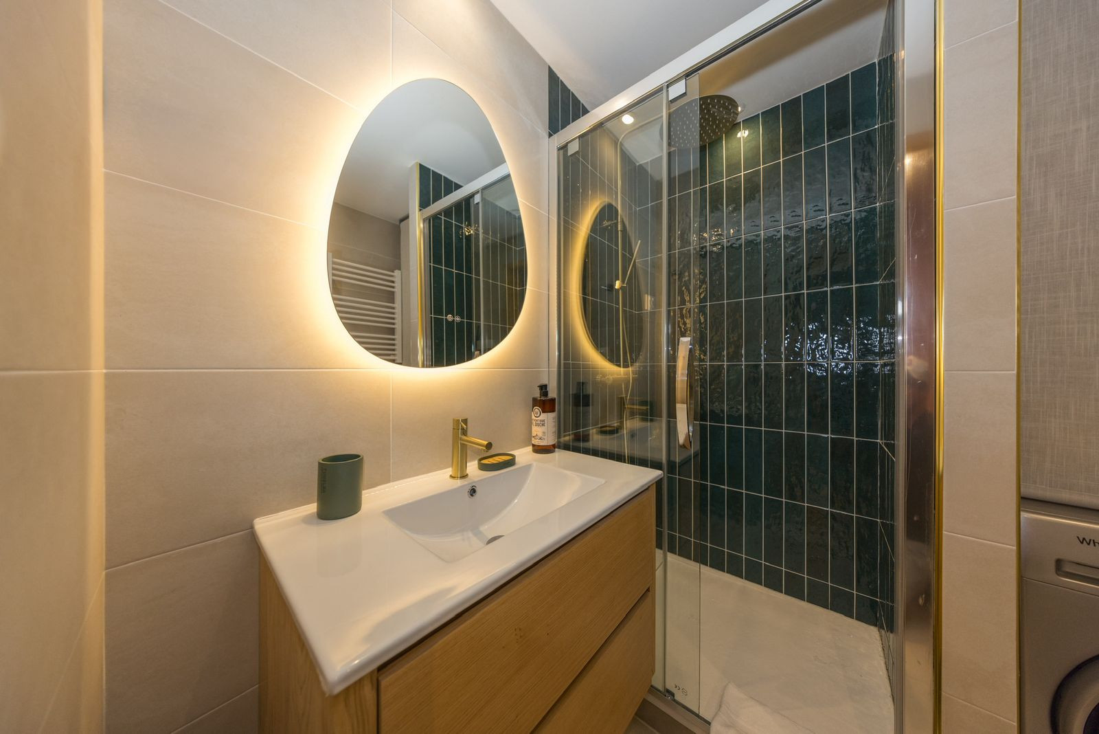 ✅ Une salle de bain fonctionnelle avec douche, vasque, sèche-cheveux et machine à laver.