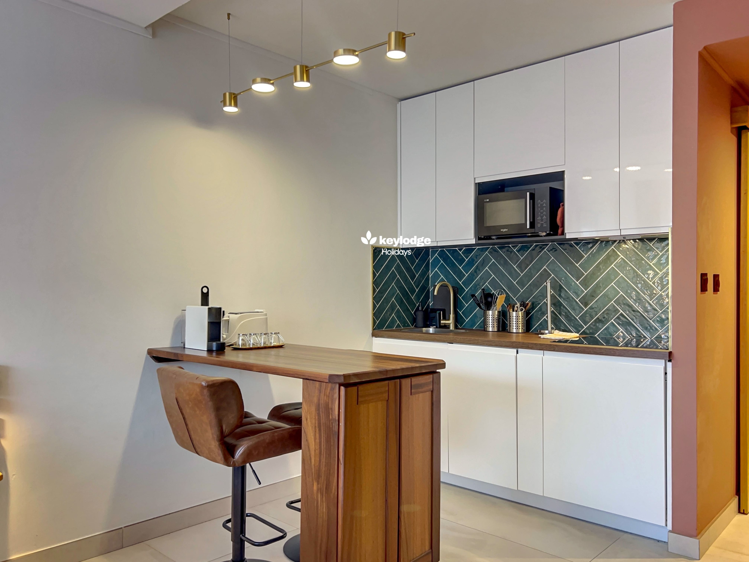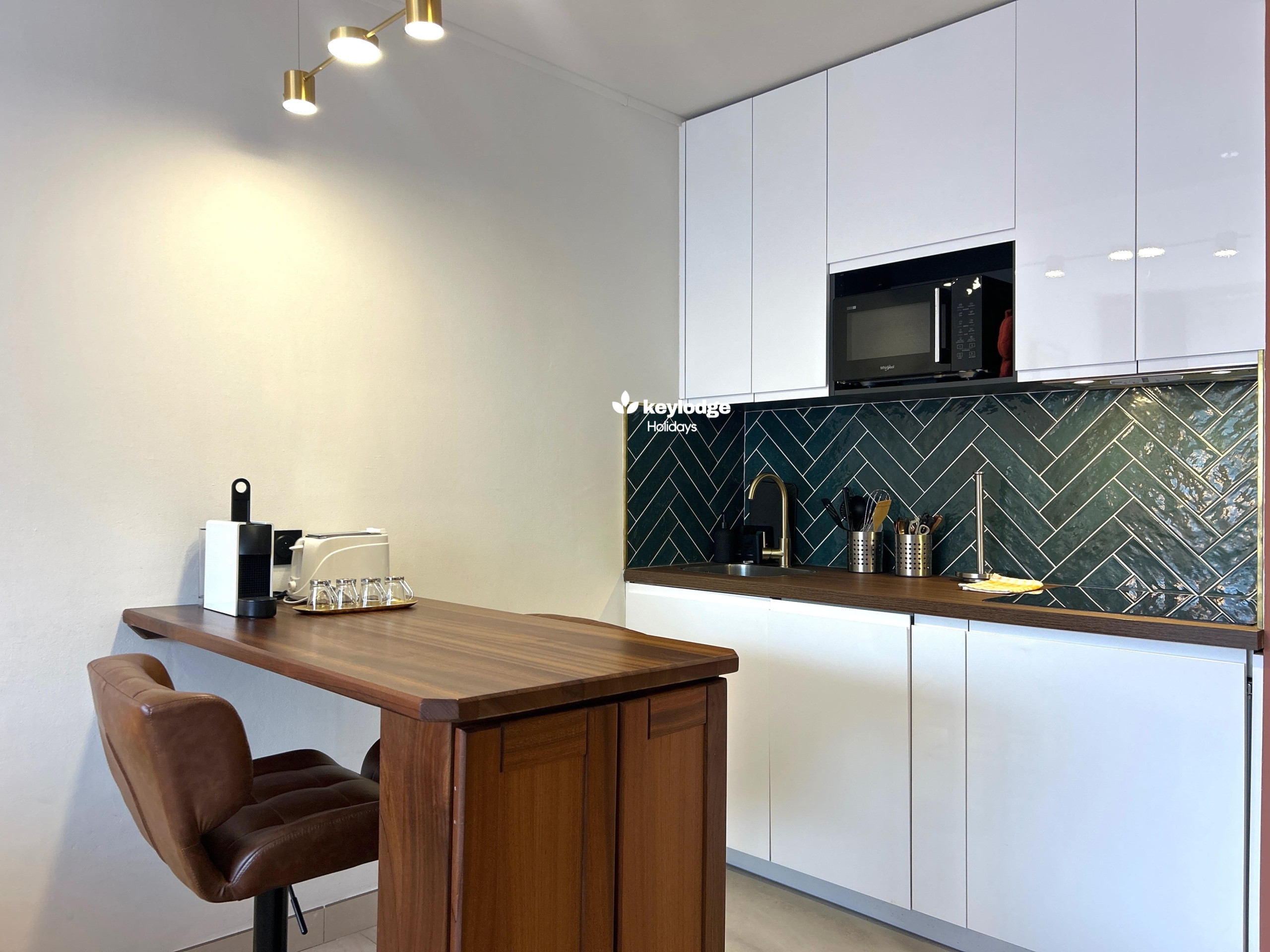 ✅ Une cuisine intégralement agencée et pensée pour votre séjour, avec toute la vaisselle et ustensiles de cuisine, cafetière, micro-ondes, lave-vaisselle ainsi qu’un réfrigérateur