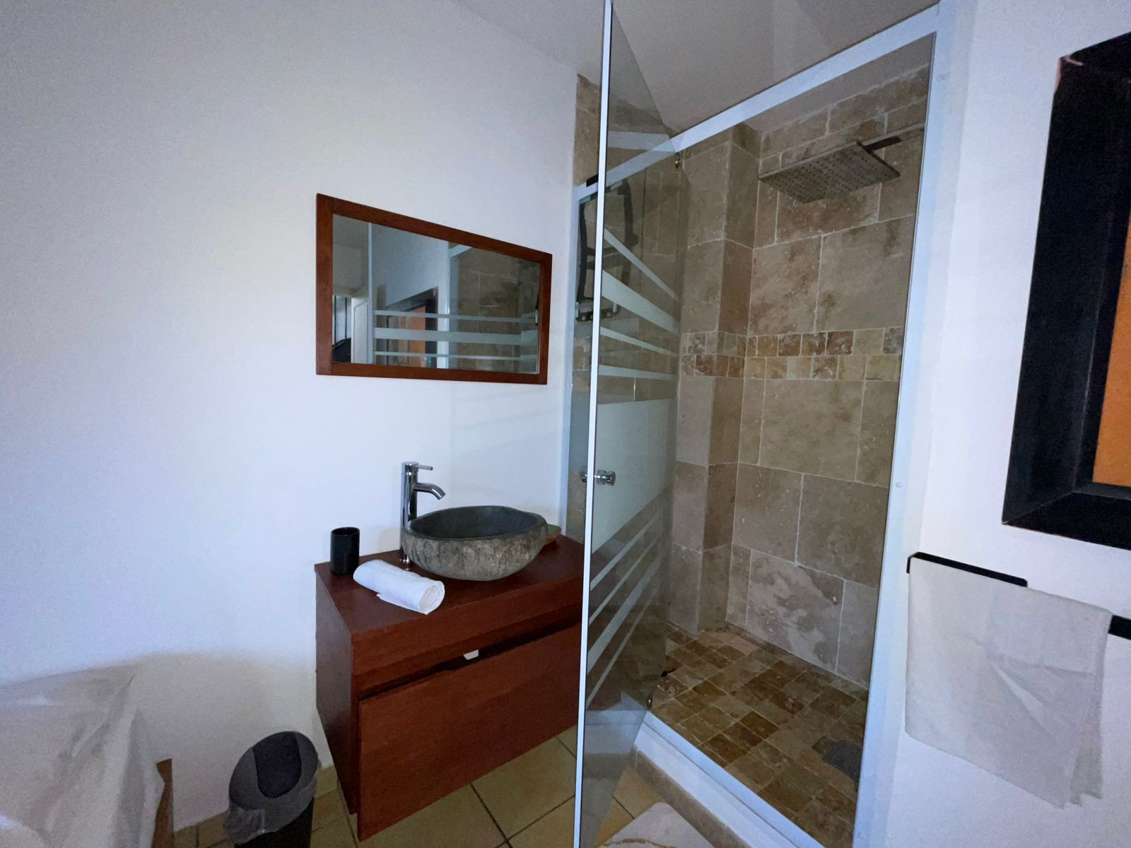 ✅ Une salle de bain fonctionnelle équipée d’une douche à l’italienne, d’une vasque et d’un coin rangement.